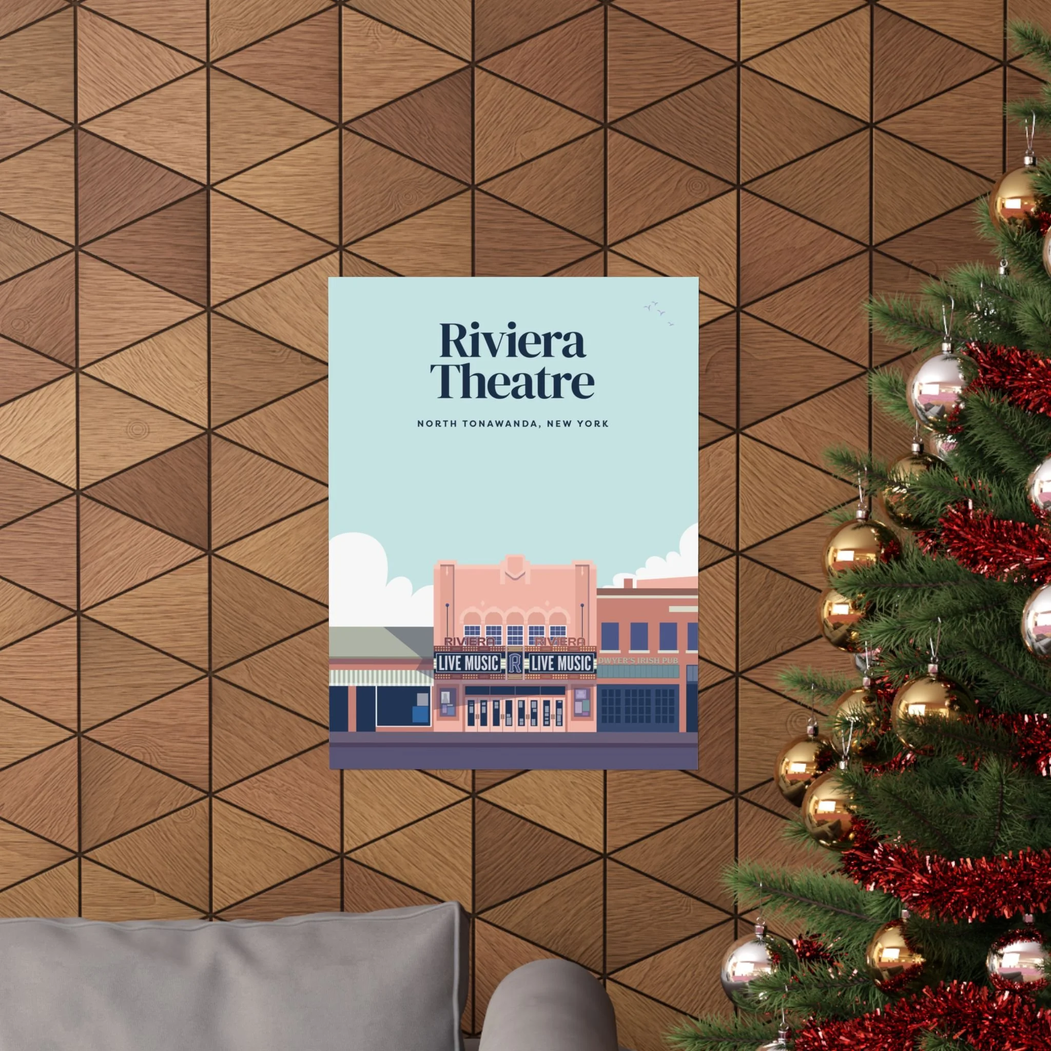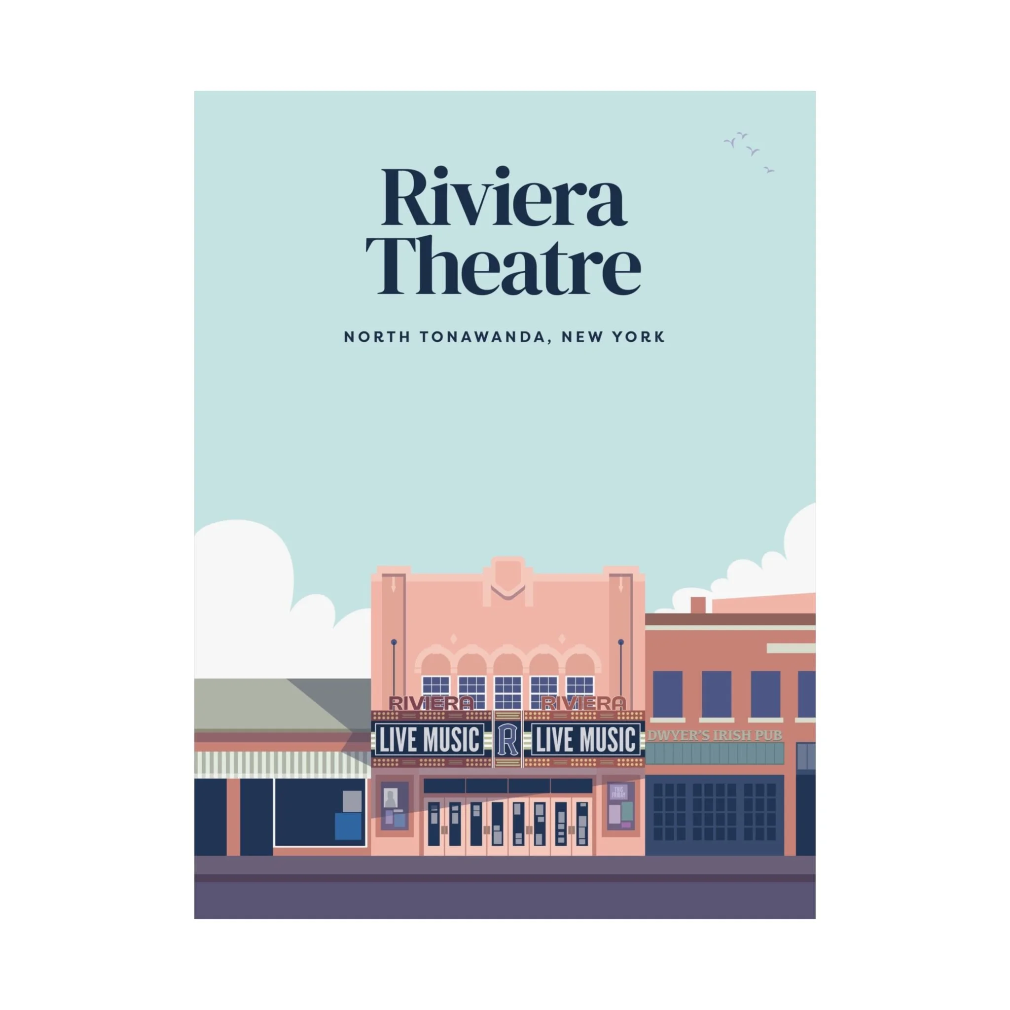 Celebrate one of North Tonawanda’s most iconic landmarks with this flat-style illustration of the historic Riviera Theatre. Showcasing its classic marquee, vintage architecture, and the unmistakable charm that has made the Riv a hometown favorite for generations, this print captures the spirit of local arts and live music. Perfect for fans of the theatre, lovers of NT history, or anyone who wants to bring a touch of hometown pride to their home or workspace, this poster makes a timeless addition to any wall..